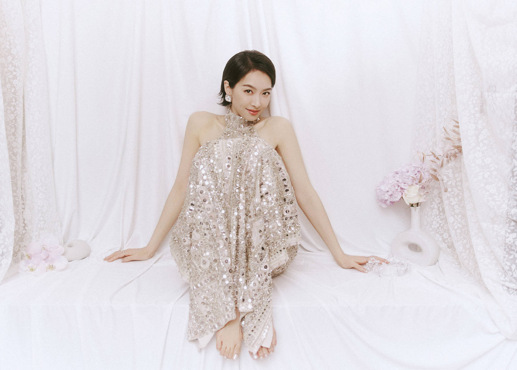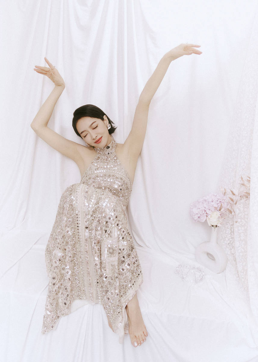 光影的巧妙运用,是氛围营造的核心,为写真注入了灵魂。拍摄采用冷调与暖调光影交替的方式,打造出多元的氛围层次。冷调光影下,闪钻的光芒更显清冷璀璨,宋茜的轮廓线条被勾勒得愈发立体,眼神疏离而坚定,传递出一种生人勿近的冷艳气场,与礼服的高级质感形成呼应。暖调光影下,柔和的光线包裹周身,弱化了闪钻的冷硬感,让宋茜的肌肤更显通透,姿态也多了几分温柔,眼神中的坚定掺杂了些许魅惑,将性感与温柔的矛盾感演绎得淋漓尽致。光影的明暗对比更是精准,亮部聚焦于礼裙的闪钻与身形曲线,暗部则弱化背景干扰,让人物与背景自然分离,凸显造型的立体感与层次感。