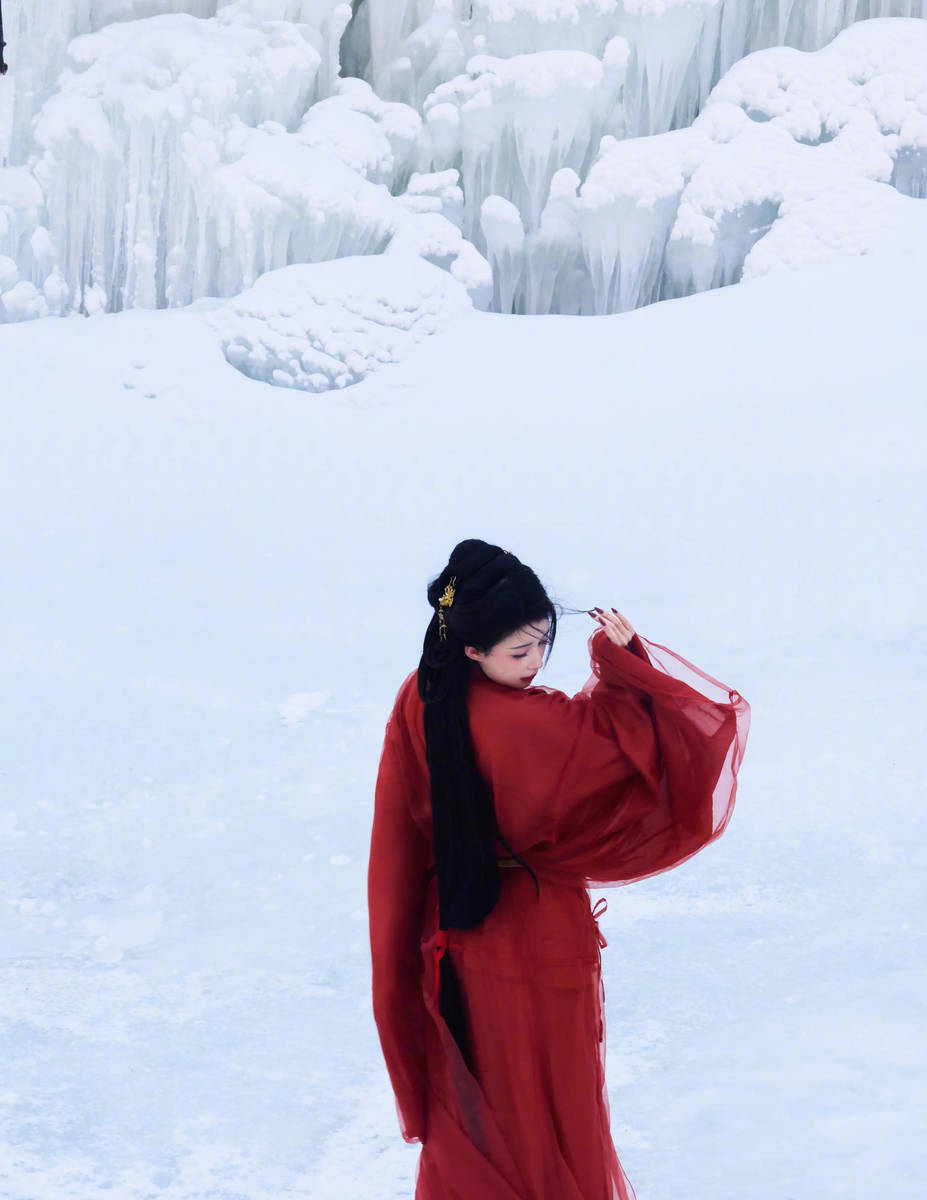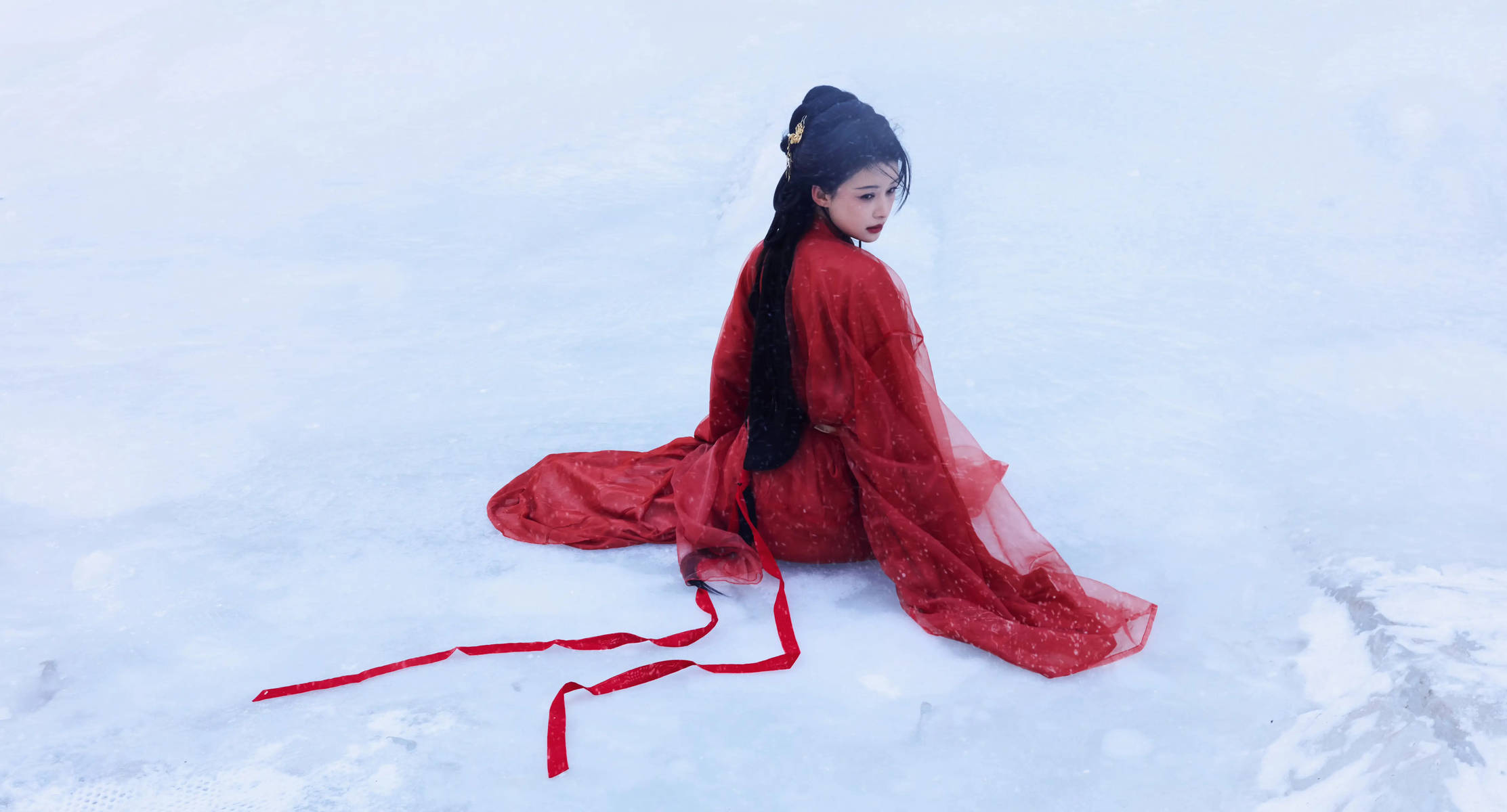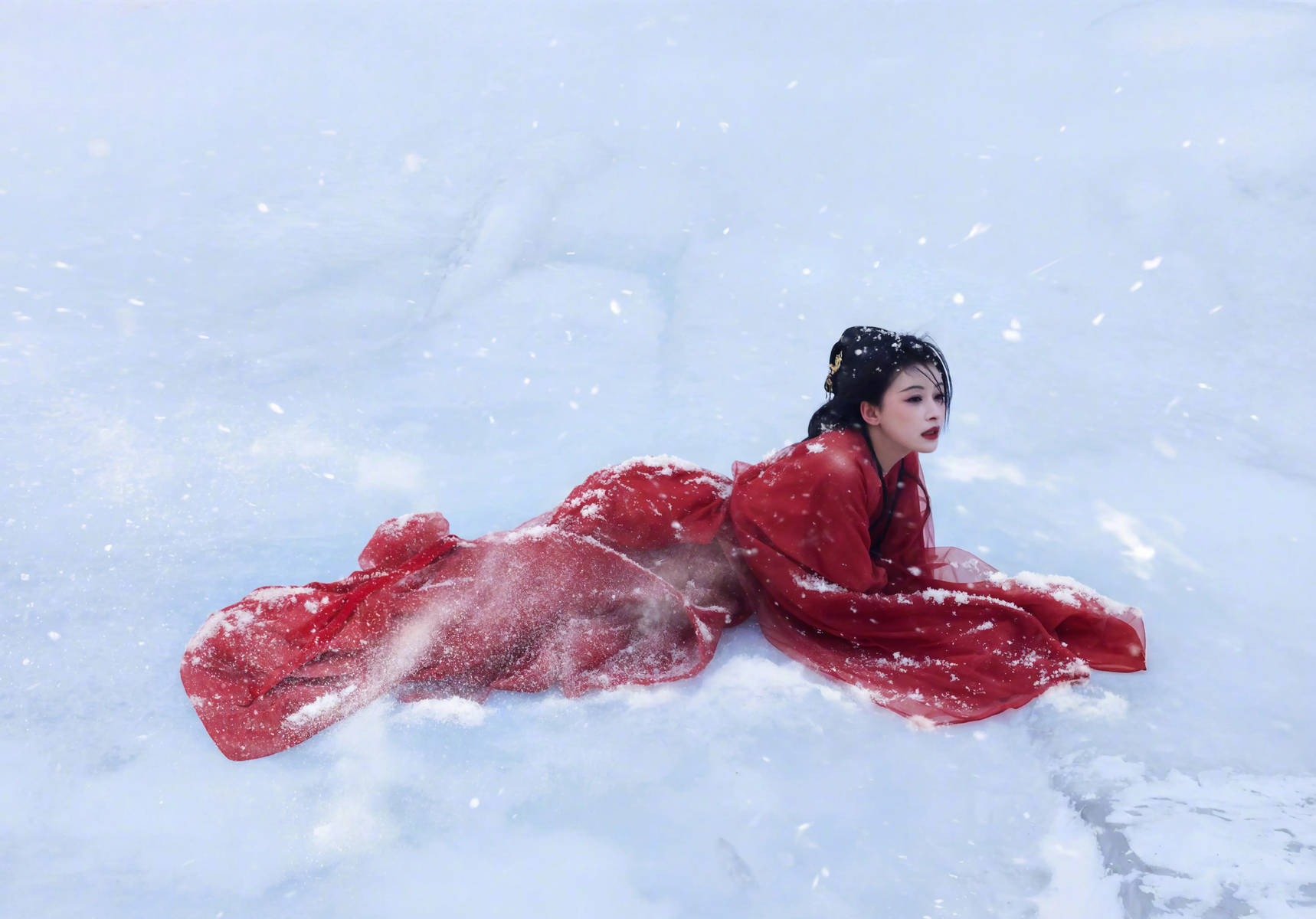 这组写真的中式美学内核,体现在对“写意留白”与“情景交融”的传承与创新。中式美学追求“言有尽而意无穷”,这组写真便以雪地为载体,用大量留白营造出苍茫辽远的意境,让观众在欣赏画面的同时,能够自由联想背后的故事,实现“以景喻情”的表达效果。红襦与白雪的搭配,不仅是色彩的对比,更是情感的隐喻——红色代表着未灭的赤诚与执念,白色代表着命运的清冷与无常,二者相互映衬,将中式美学中“哀而不伤”的审美追求演绎得恰到好处。这种创作方式,摒弃了传统古风写真对服饰、道具的过度追求,转而聚焦于意境的营造与情感的传递,回归了中式美学的本质。