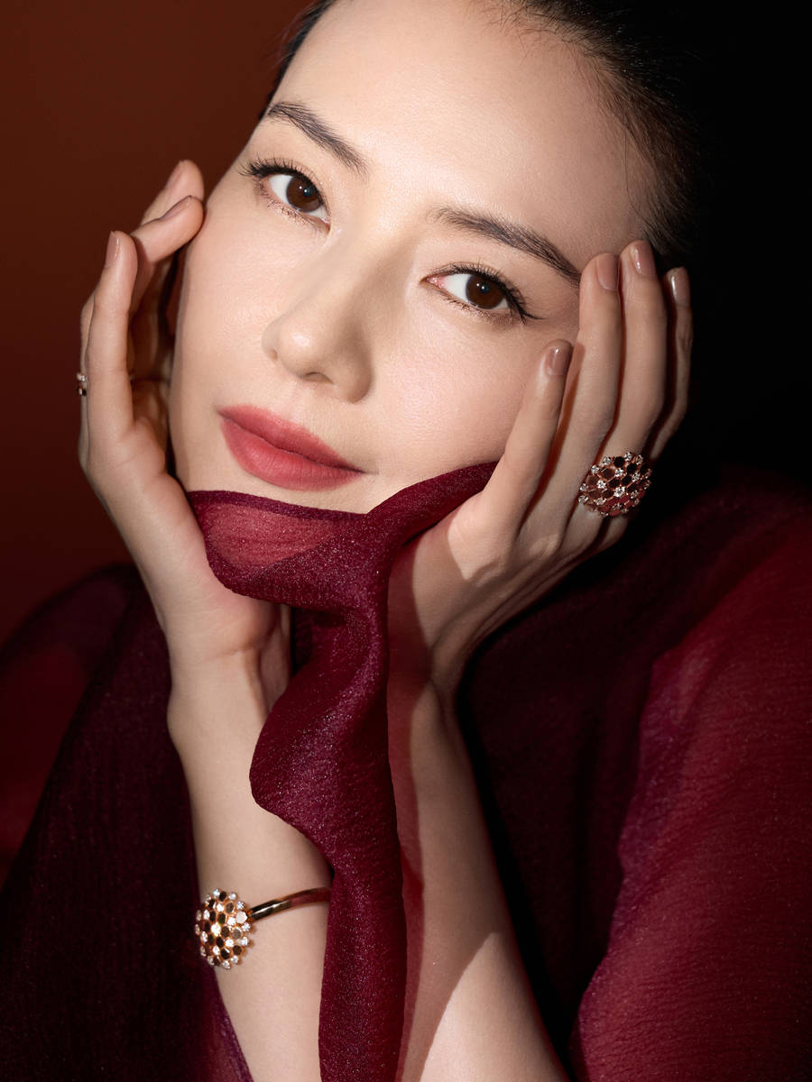 妆容上,高圆圆采用了清透精致的妆容,与整体造型完美呼应,进一步凸显了她的美貌与气质。眉形柔和自然,线条流畅,不刻意锋利,却能凸显出她的五官优势;眼妆清淡却有神,淡淡的大地色眼影晕染,让眼神更加深邃灵动,眼尾微微下垂,增添了几分温柔感;唇妆选用与纱裙同色系的酒红色,色泽饱满,质地水润,衬得她的嘴唇饱满小巧,气色愈发红润,眉眼间的温柔与从容,尽显成熟女性的魅力,没有浓妆艳抹的刻意,却美得恰到好处。