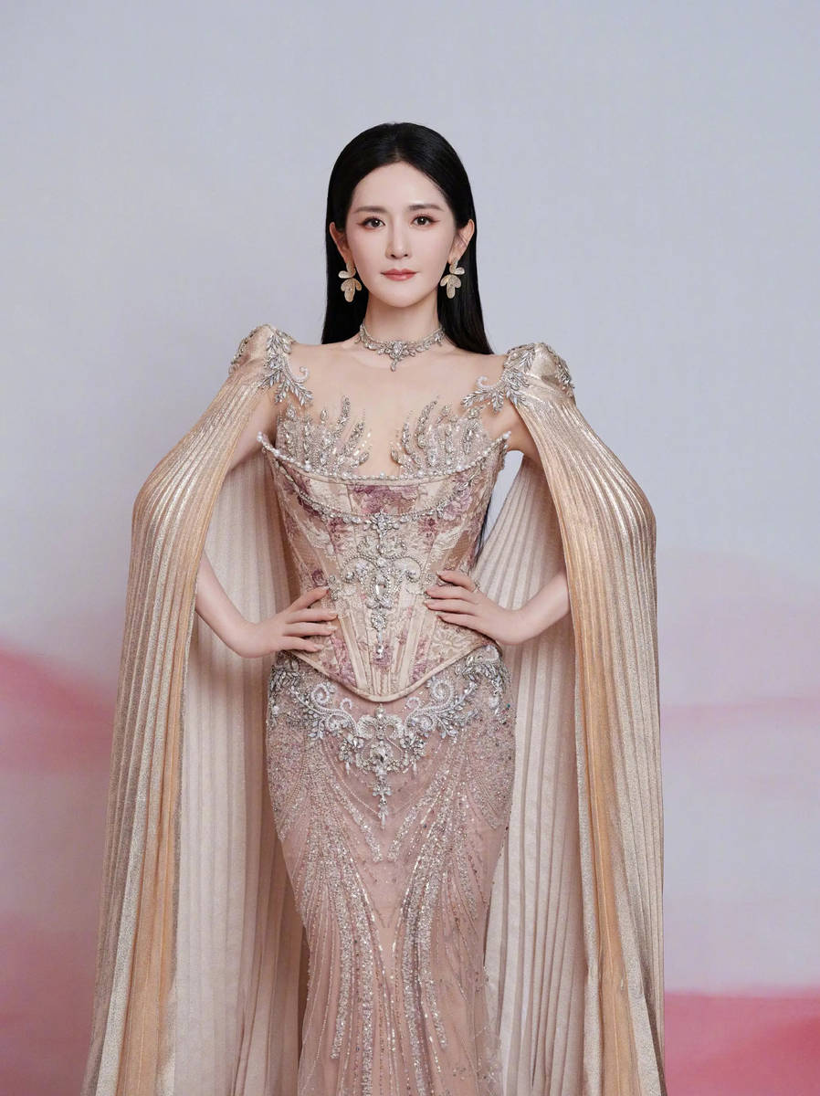 最令人惊艳的一套造型,是谢娜身着香槟色亮片长裙,长裙以细腻的亮片为基底,在灯光的照射下,泛着柔和的光泽,宛如星光落在身上,璀璨夺目却不张扬,完美诠释了“太阳女神”的光芒。长裙采用简约的抹胸设计,恰到好处地勾勒出优美的肩颈线条与精致的锁骨,露出莹润通透的肌肤,与香槟色亮片相互映衬,更显肌肤白皙细腻。裙摆自然垂落,微微散开的弧度如同花瓣一般,行走间,亮片随动作轻轻晃动,自带灵动的韵律感,宛如从星光中走出的女神,光彩照人、温柔动人。