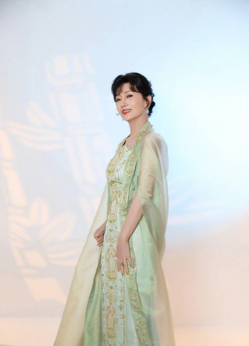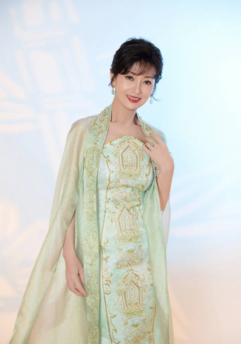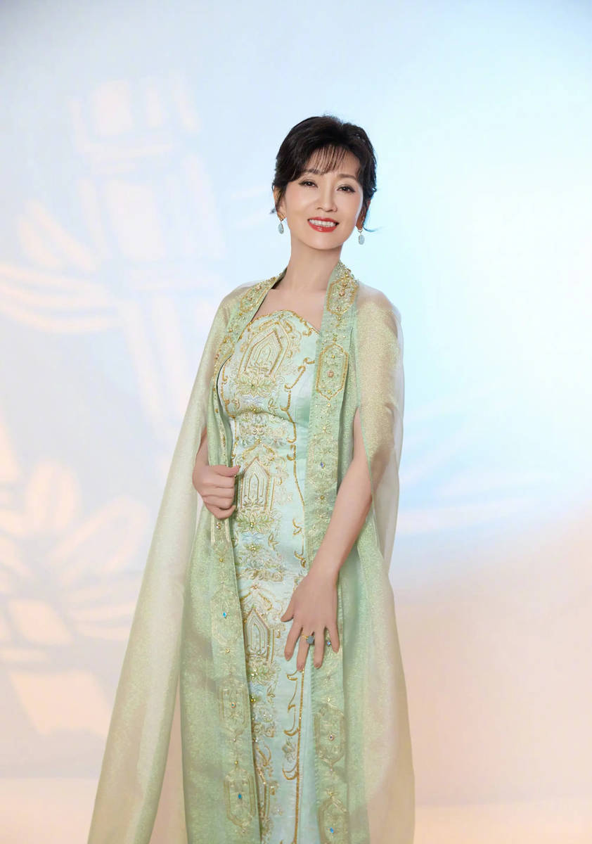 赵雅芝此次选择的青绿刺绣礼服,看似简约,实则暗藏巧思,每一处细节都透露着匠心与精致。礼服的面料选用优质材质,质地柔软细腻,轻盈透气,贴身穿舒适无束缚,完美贴合国风穿搭的舒适理念。青绿色调温润而雅致,不张扬、不浮夸,自带一种干净纯粹的气质,与赵雅芝本身的温婉优雅高度契合,让她看起来更加温润如玉,宛如东方画卷中的美人,端庄又动人。